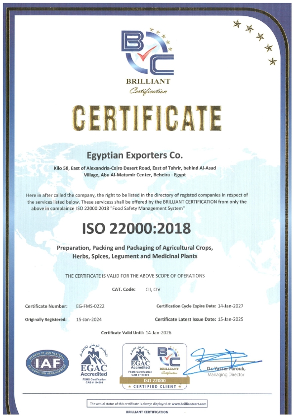 تعتبر شركة المصدرين المصريين واحدة من ابرز الشركات المتخصصة فى تصدير الأعشاب والتوابل و بذور الانبات و البقوليات لجميع انحاء (كافة ارجاء) العالم. خلال اكثر من 15 عاما من الخبرة فى مجال التصدير تقدم شركة المصدرين المصريين منتجات باعلى جودة و افضل الاسعاربخدمة لا نظير لها . تمكنا, عن طريق اتباع معاييرالسوق العالمية, من الوصول الى رضا عملائنا و توسيع افاق صادراتنا لتصل الى أسواق اوروبا و امريكا اللاتينية و آسيا والشرق الأوسط.